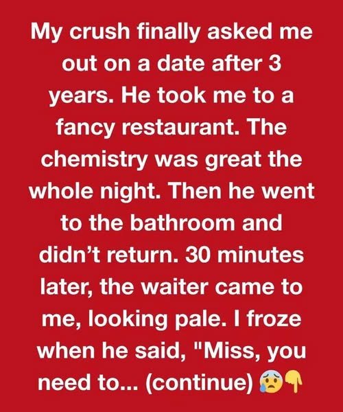 Then, he went to the bathroom and didn’t return. Thirty minutes later, the waiter approached me, looking very pale. I froze when he said, “Miss, you need to cover the bill.”