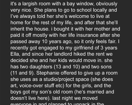 “She moved me, Dad,” she whispered. “My stuff’s in the basement.”