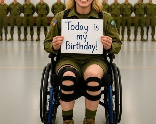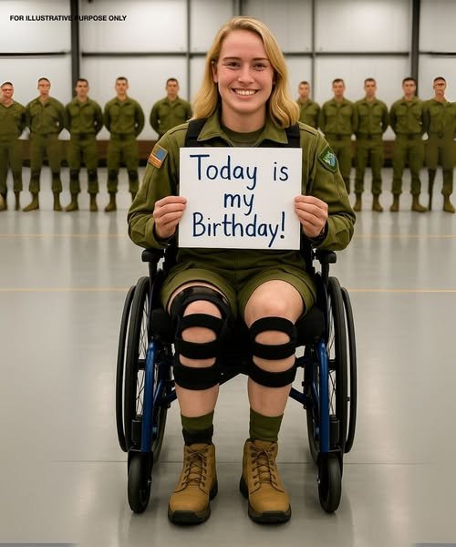 In the image, a young woman dressed in military uniform is captured sitting in a wheelchair, holding a sign with a simple but meaning message: “Today is my Birthday!” Behind her, her fellow soldiers stand proudly in formation, performing their support.